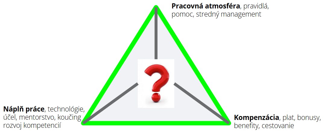 Späť teda k modelu. Kolegu, zamestnanca (vrátane seba) chápem v tomto modeli ako guličku/otáznik vo vnútri trojuholníka, na ktorého vplývajú vyššie uvedené sily. Ak sú viac-menej v rovnováhe, gulička je v strede, človek zostáva vo firme, je produktívny a angažovaný. Ak sa dostane do výraznej nerovnováhy a gulička sa dostane na jeden z okrajov - človek z firmy odchádza, či už naozaj, alebo ide o tichý exit (zostáva vo firme, ale je odpojený).